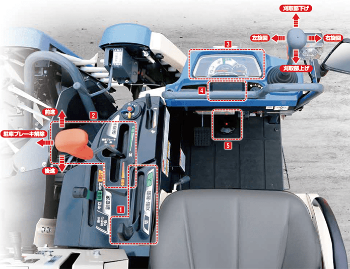 レバー1本で刈取作業の準備が完了する「刈取スタートレバー」や、前進・後進・停止が簡単に操作できる「イージーシフト」など、誰にでも扱いやすい操作系統を採用しています。枕地での掻き込みはブレーキペダルを踏み込み、HSTレバーを倒すだけで簡単に行えます。また運転席に座ったままでナローガイドの張出・収納ができる「リモコン分草杆」により、変形田での作業も機体を蛇行させることなくスムーズに行えます。 - 高い適応性と作業効率