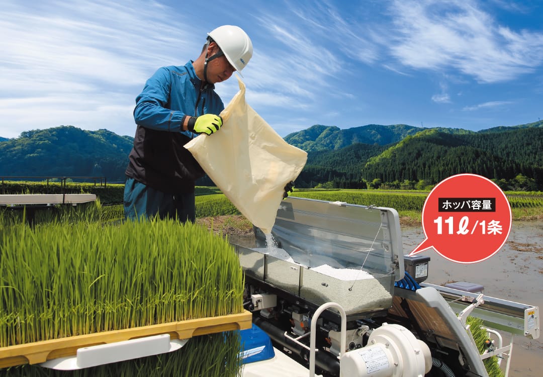 ヰセキ独自の3分割ロータを標準装備し、泥押し・波立ちを抑えながら、植付けと同時に枕地をならすことができます。ロータの高さは植付部のレバーで7段階調節が可能で、ほ場条件に合わせた最適な設定ができます。 - 省力化を実現・疎植株間標準装備